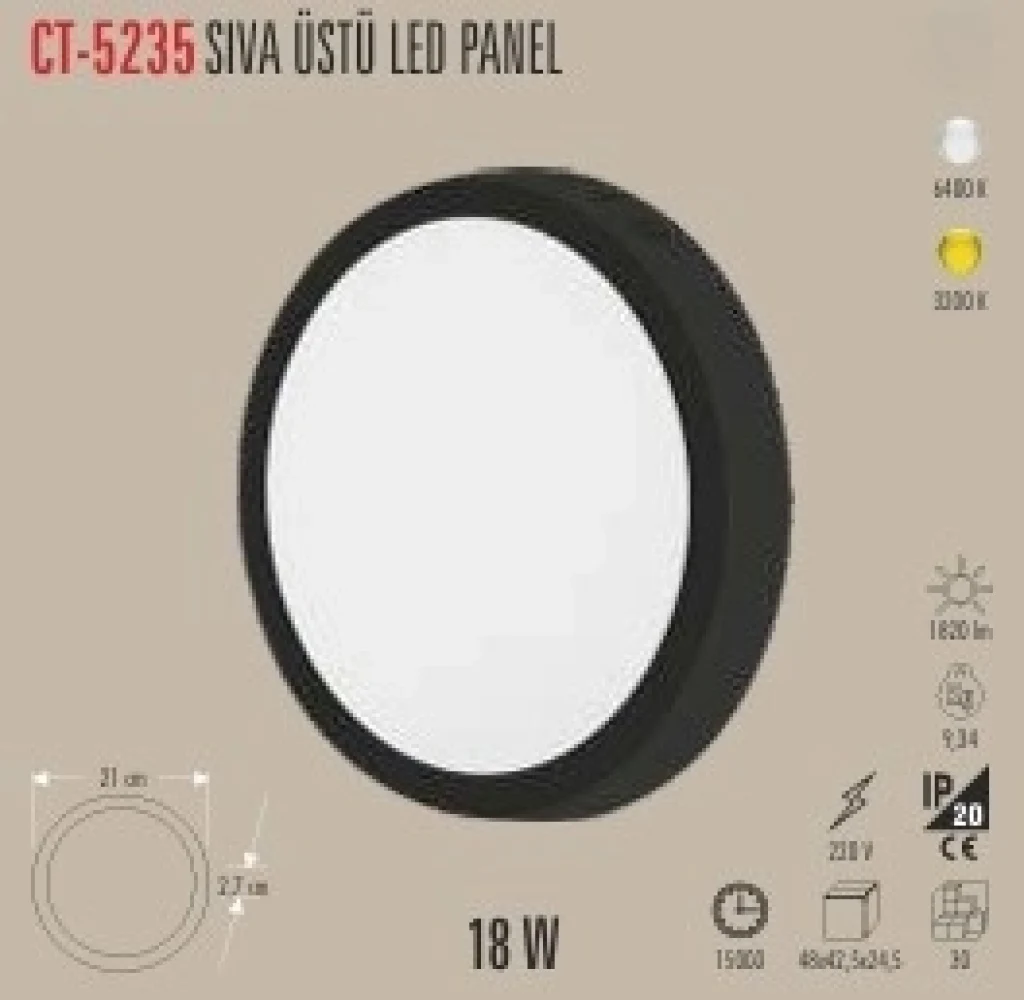 CT-5233 18W SIVA ÜSTÜ LED PANEL 2 IŞIK SEÇENEĞİ BEYAZ 6400K&GÜNIŞIĞI 3200K